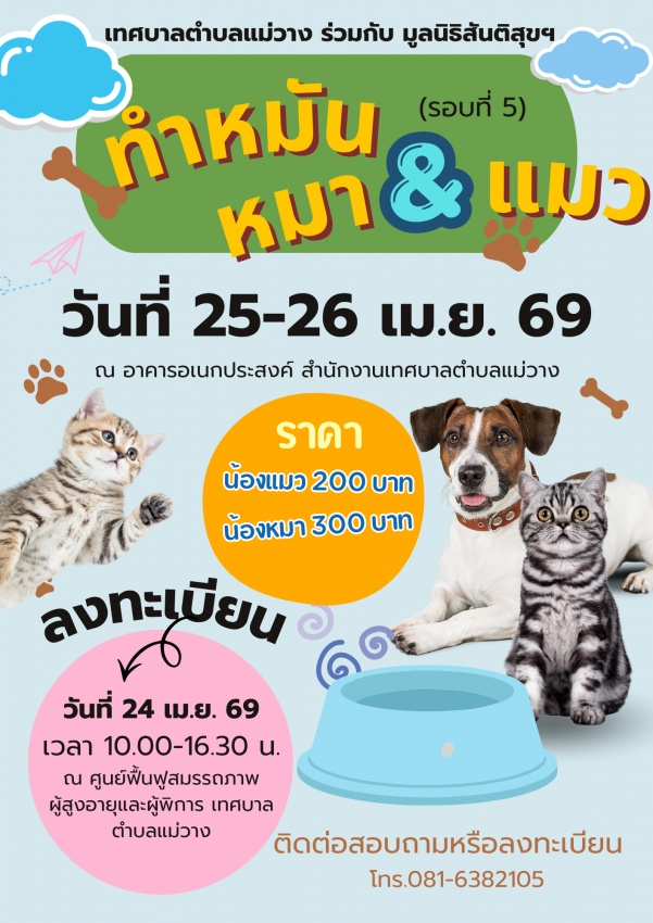 เทศบาลตำบลแม่วาง ร่วมกับ มูลนิธิสันติสุขฯ ให้บริการทำหมันสุนัขและแมว (รอบที่ 5) ในวันที่ 25-26 เมษายน 2569 สามารถลงทะเบียนได้ในวันที่ 24 เมษายน 2569 ตั้งแต่เวลา 10.00น.-16.30 น. ณ อาคารศูนย์ฟื้นฟูสมรรถภาพผู้สูงอายุและผู้พิการ (สำนักงานเทศบาลตำบลแม่วาง) หรือสามารถโทรศัพท์เพื่อลงทะเบียนได้ที่เบอร์ 081-6382105